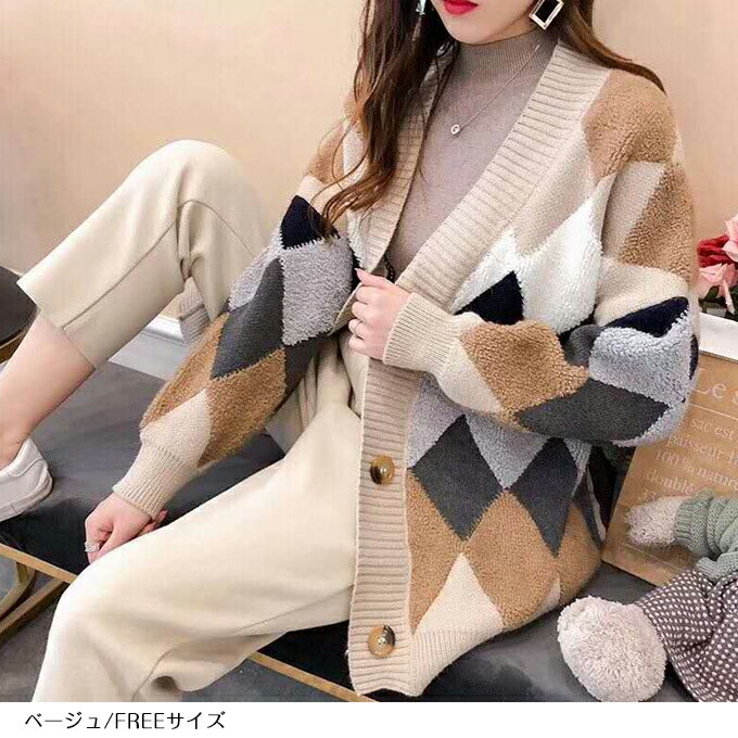 [関連ワード]ニットカーディガン トップス ニット レディース アウター ボア アーガイル柄 マルチカラー 長袖 vネック シンプル 秋カラー 秋物 秋冬 ブラック 黒 ホワイト 白 ベージュ 【 マルチカラーニットカーディガン 】【秋冬 新作】【2019年10月新作 アウター】